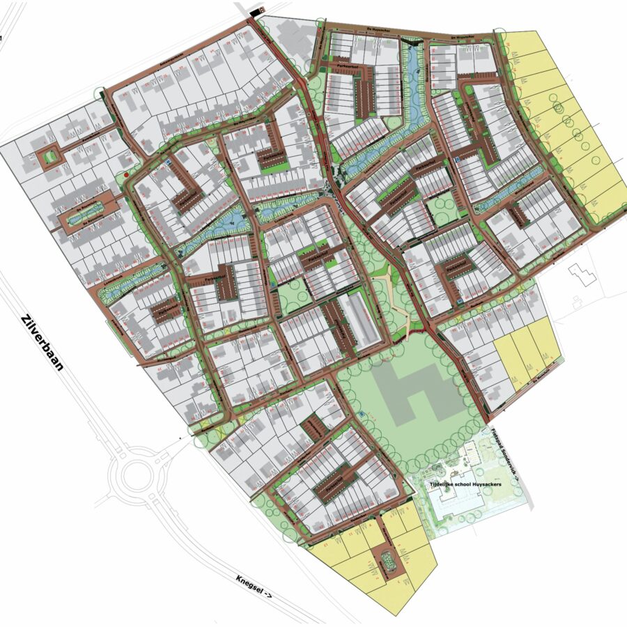 Onze buurt Huysackers is in aanbouw en alle huizen en kavels zijn verkocht. Hoe komt het er nu in de toekomst uit te zien? Zoals we in het inrichtingsplan kunnen zien is het ontwerp van de buurt af. Hieronder een plaatje van de inrichting van de buurt. De buurt heeft veel groen en waterpartijen. Ook is er ruimte gereserveerd voor speelvelden voor de kinderen. In het midden van de buurt is een open ruimte: De Brink. Er loopt een fietsstraat door de buurt van noord naar zuid langs de Brink en langs de nieuwe basisschool. Auto’s zijn hier welkom, maar fietsers hebben voorrang. De Huysacker is een weg die als een slinger door de buurt loopt. Dit is de autoroute om van de westkant naar de oostkant te kunnen rijden. De Roskam loopt ook van west naar oost, maar is ter hoogte van de Brink afgesloten voor auto’s. Hier kunnen wel fietsers de oversteek maken. De buurt kent nu 1 toegangsweg voor autoverkeer: via de rotonde kun je buurt binnenrijden over de Roskam. Voor fietsers zullen er veel meer mogelijkheden zijn om de buurt binnen te rijden