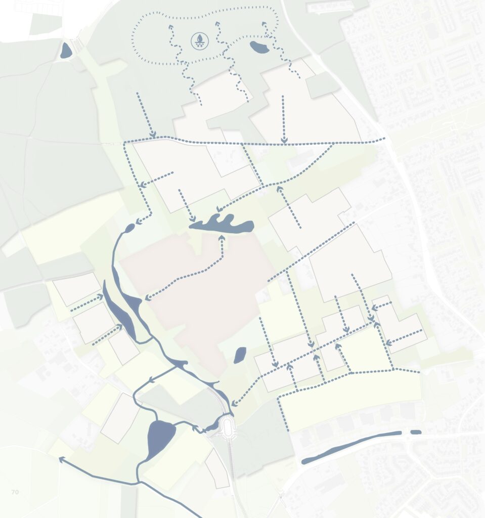 Het water dat wordt opgevangen op daken en in tuinen zal worden afgevoerd naar de straat. Via de straten stroomt het water naar beekjes en naar de grotere bassins rondom de buurt. Hieronder een plaatje van de waterafvoer en waterberging in de wijk Zilverackers. Om deze reden moeten we dus geen chemische onkruidbestrijdingsmiddelen gebruiken en zal er op de wegen in de winter geen strooizout worden gebruikt.