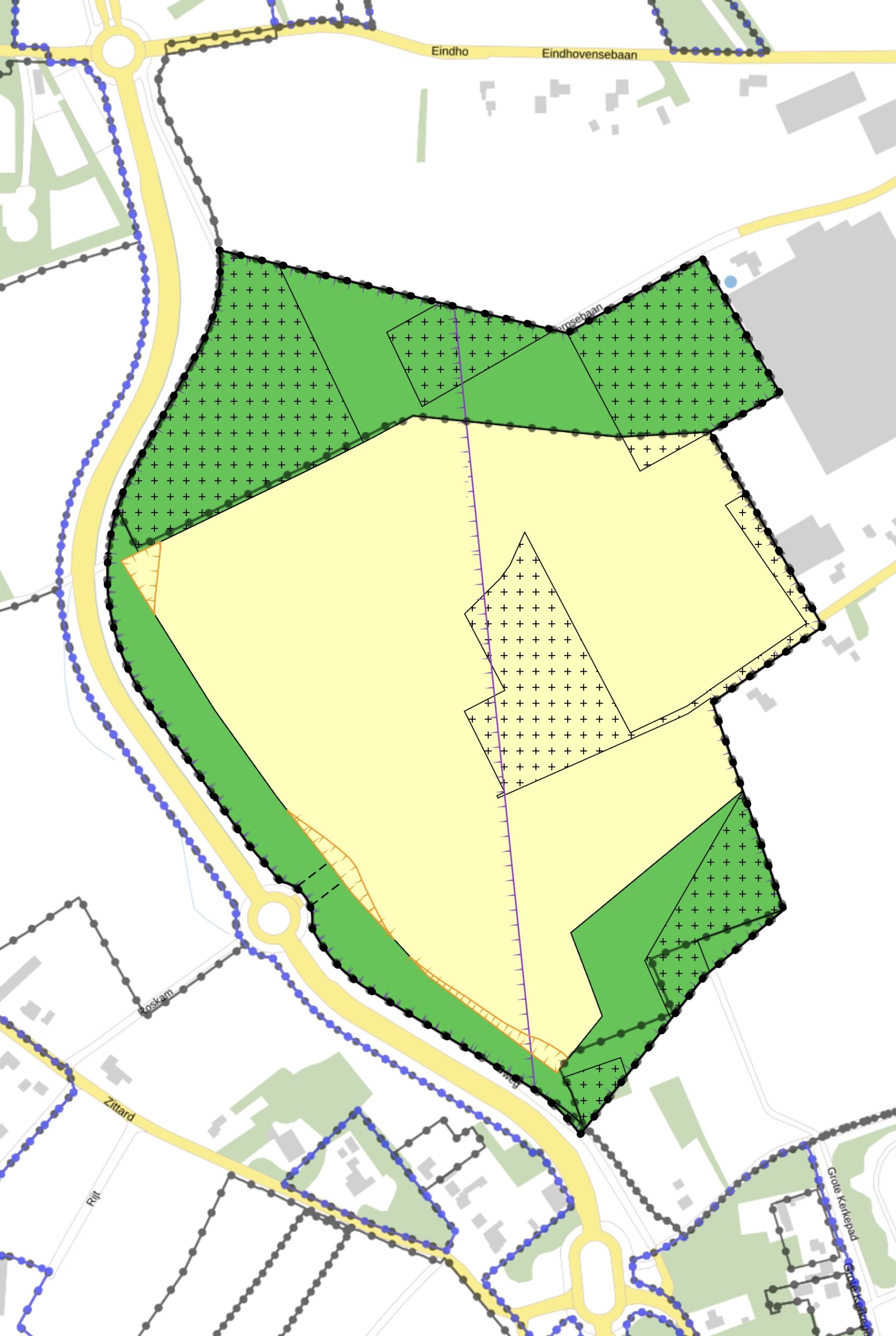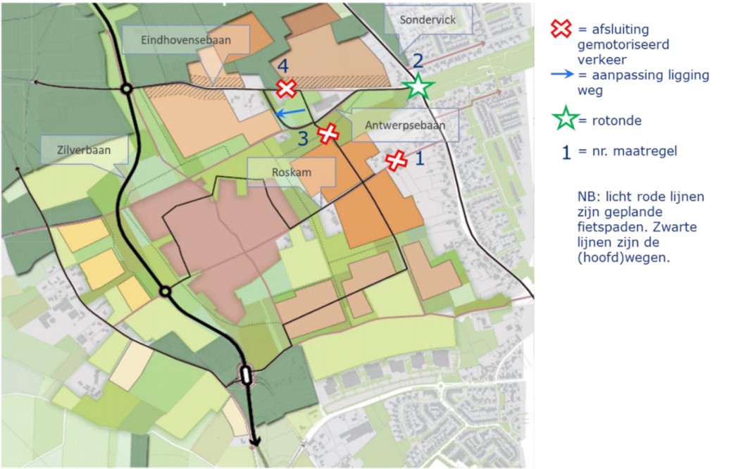 Een wijziging op het originele bestemmingsplan is doorgevoerd op 20 april 2021. De bewoners aan de Sondervick maakten zich zorgen om de grotere verkeersdruk in hun straat. Naar aanleiding van hun zienswijzen op het bestemmingsplan is er een wijziging gemaakt: de route van Huysackers naar de Eindhovensebaan wordt afgesloten. Hierdoor kunnen we met de auto vanuit Huysackers niet direct via de Boerenbond naar de Sondervick rijden. De route zal moeten gaan via de rotonde op de Zilverbaan om daar naar het noorden naar de Eindhovensebaan te rijden. Het kaartje hieronder laat de wijzigingen zien. Het is wenselijk dat de Roskam wordt afgesloten voor autoverkeer. De Roskam is niet berekend op veel autoverkeer. Vandaar de afluiting aangegeven bij de rode kruis [1]. De andere afsluiting [3] is waarbij auto’s niet meer vanuit Huysackers naar de Eindhovensebaan kunnen rijden. De andere wijzing bij [4] is om de weg rondom de Boerenbond wat te verleggen. We zien ook dat er een rotonde [2] zal komen op de Sondervick ter hoogte van de Eindhovensebaan om de verkeersveiligheid te waarborgen. Er zullen een tweetal woningen worden gesloopt om dit mogelijk te maken.
