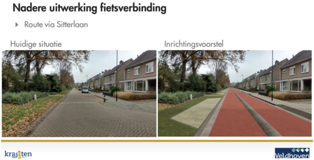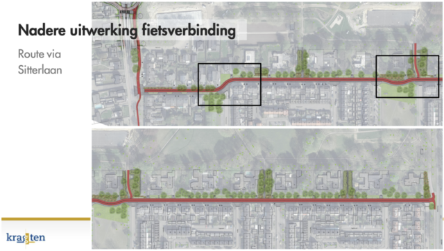 De huidige coalitie heeft gekozen voor de optie Sitterlaan/Saturnus. Het plan is om deze straten om te bouwen tot een fietsstraat. Hiervoor trekt de gemeente bijna 3 miljoen euro uit. De conceptafbeeldingen zijn bij dit bericht toegevoegd. U ziet de nieuwe fietsstraat zonder drempels, waarbij fietsers voorrang hebben bij alle zijstraten. Parkeren op de fietsstraat is niet mogelijk. Verder ziet u ook de volgende wijzigingen: (1) op de Sitterlaan worden parkeervakken gemaakt nabij de huidige groenstroken, (2) op de Saturnus komt een rechte doorgang en het groen heringericht, en (3) er komt een dubbel fietspad door het stukje groen voor de huizen Sondervick 106-114. Op de overgang van de Saturnus en Sitterlaan komt een mooie bocht voor de fietsers.