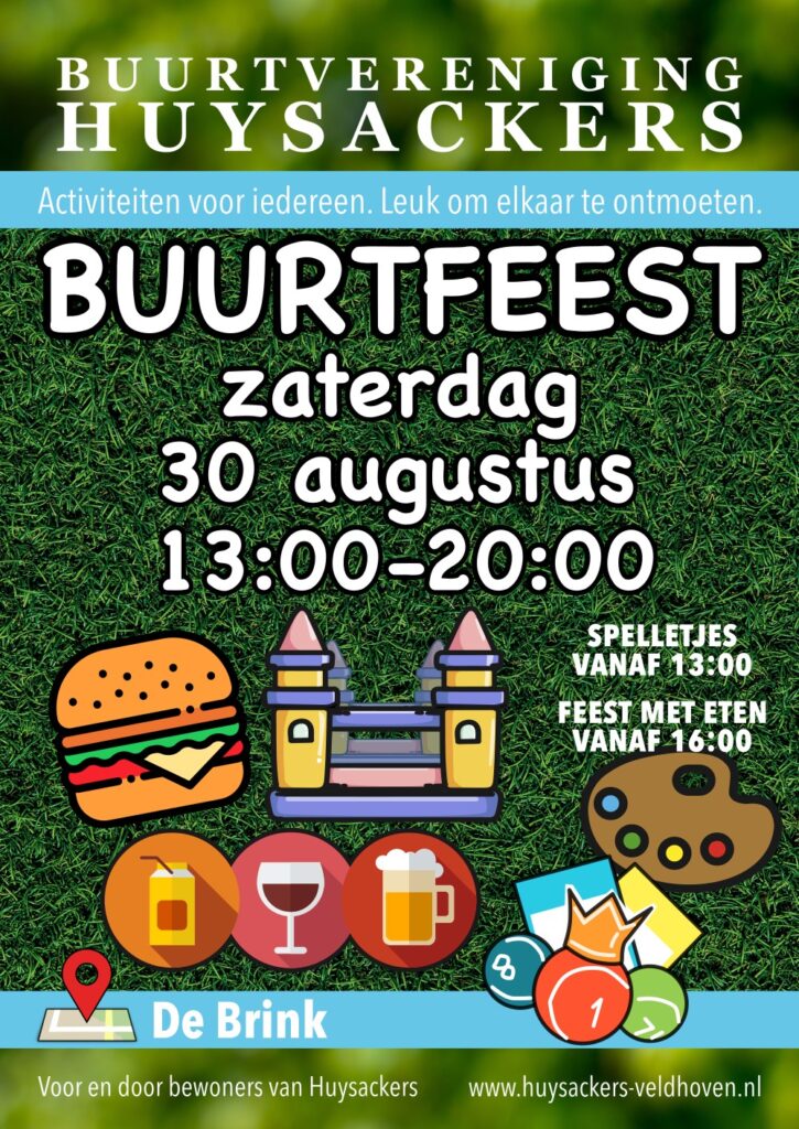 Op zaterdag 30 augustus 2025 organiseren we het jaarlijkse buurtfeest in Huysackers. Je bent welkom van 13:00 tot 20:00 uur op de Brink – het grote veld in het centrum van de buurt nabij de basisscholen.